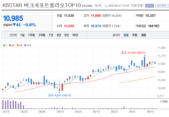 KBSTAR 버크셔포트폴리오TOP10의 상장 역사가 길지 않아 현 시점에서 주가 흐름을 예단하기는 쉽지 않아 보입니다. 무엇보다 수익률 정보가 충분치 않아 단기 주가 방향성을 가늠하기 어려운 상황입니다.
