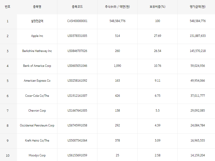 애플, 버크셔 해서웨이를 비롯해 뱅크오브아메리카, 아메리칸 익스프레스, 코카콜라 등 미국 대표 우량주들이 포트폴리오의 상당 부분을 차지하고 있는 것을 확인할 수 있습니다.